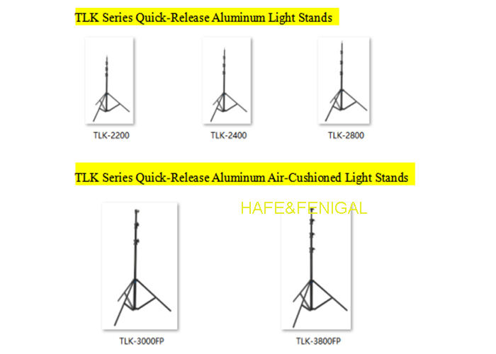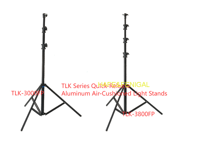 Dòng TLK bao gồm các giá đỡ đèn nhôm phóng nhanh chuyên nghiệp được thiết kế cho các nhiếp ảnh gia, nhiếp ảnh gia và kỹ thuật viên studio.Những cái đứng này có một cơ chế mở rộng nhanh cho phép chân tự động mở rộng khi đặt xuống đất và rút lại khi nâng lên, giảm đáng kể thời gian cài đặt và hỏng. Dòng bao gồm cả các mô hình phóng nhanh tiêu chuẩn và các biến thể đệm không khí (FP) để điều chỉnh chiều cao mượt mà hơn và bền hơn.